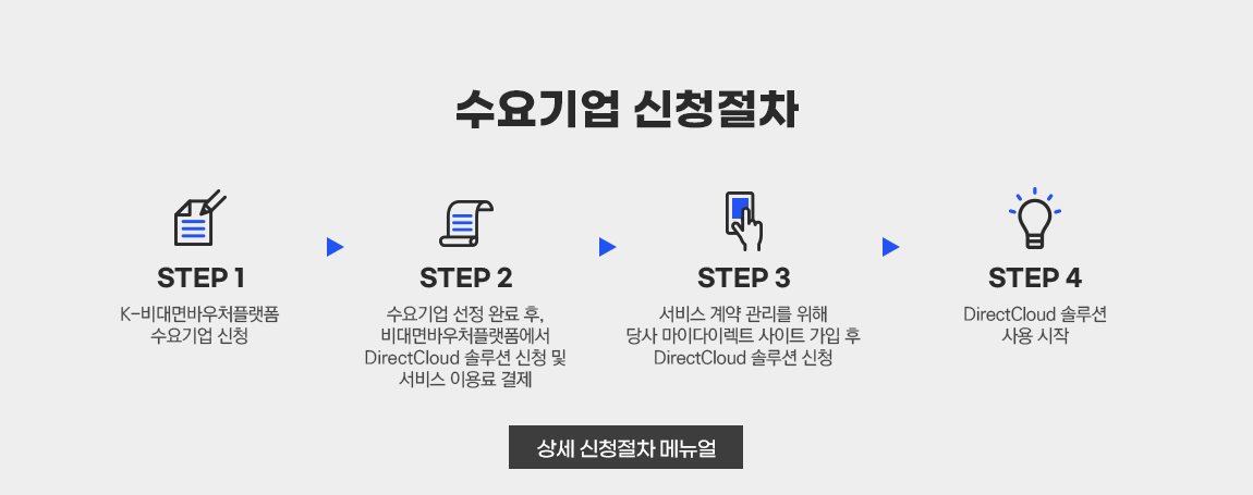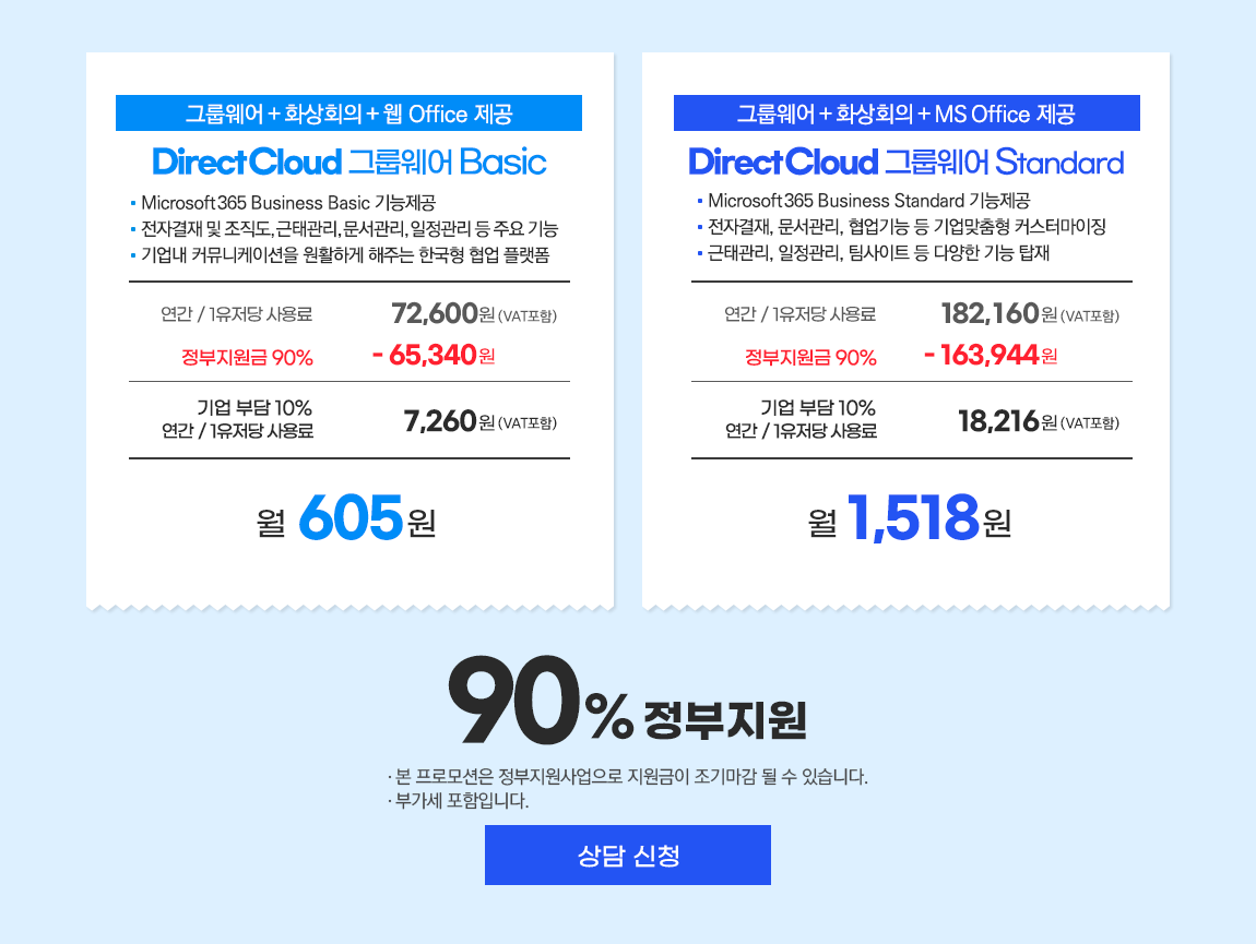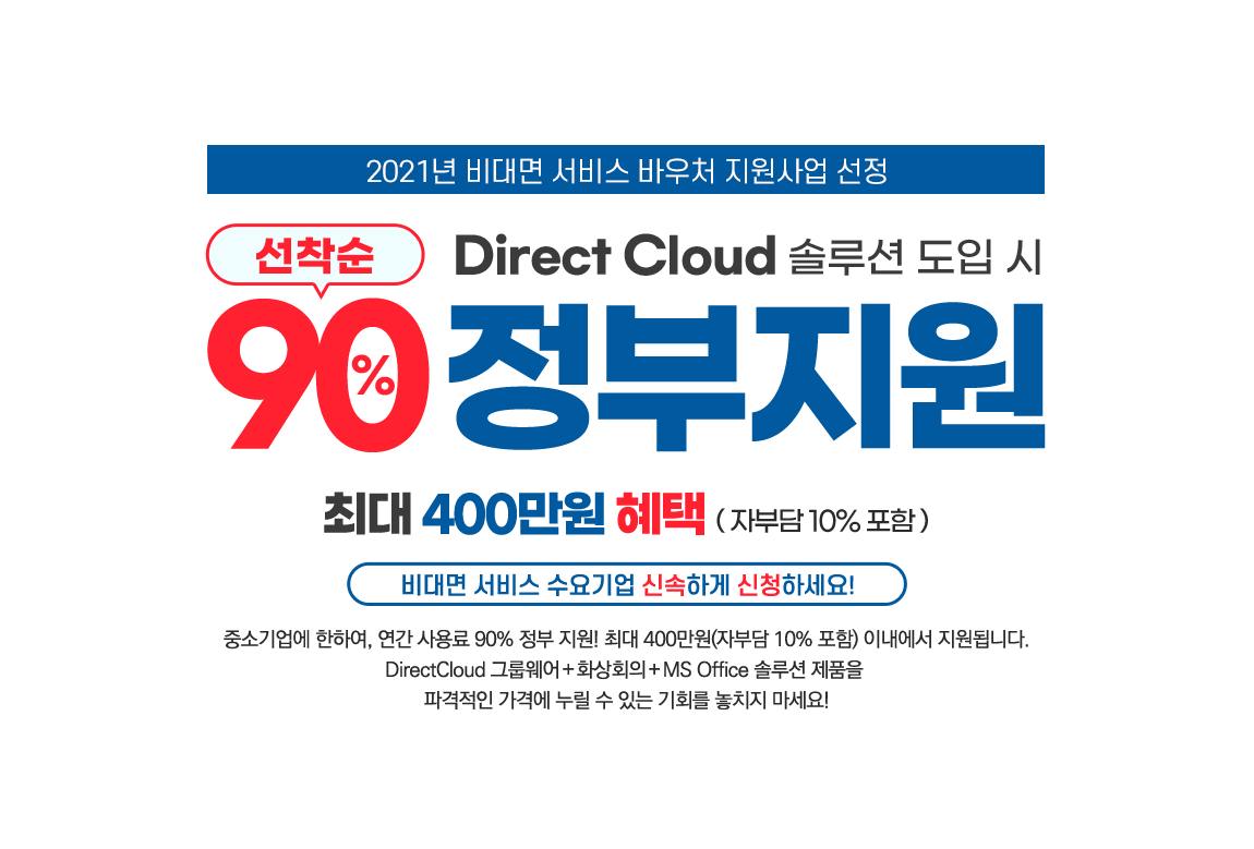| 지원 내용 | DirectCloud 그룹웨어 + 화상회의 + MS office서비스 사용료 90% 지원 최대 400만원 지원 (부가세, 자부담 10% 포함) 1개 공급기업에 최대 200만원까지만 결제 가능 |